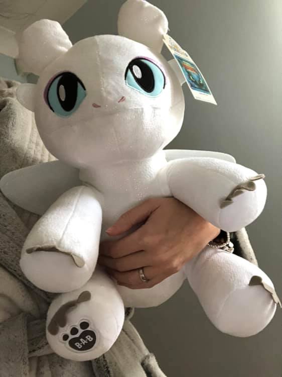 Why? Lucy got a new stuffed toy (not that you’d notice…she seems to have hundreds and I often wonder how she can fit in her bed). This one is based on the white dragon, known as a light fury, from the new How to Train Your Dragon 3 film.